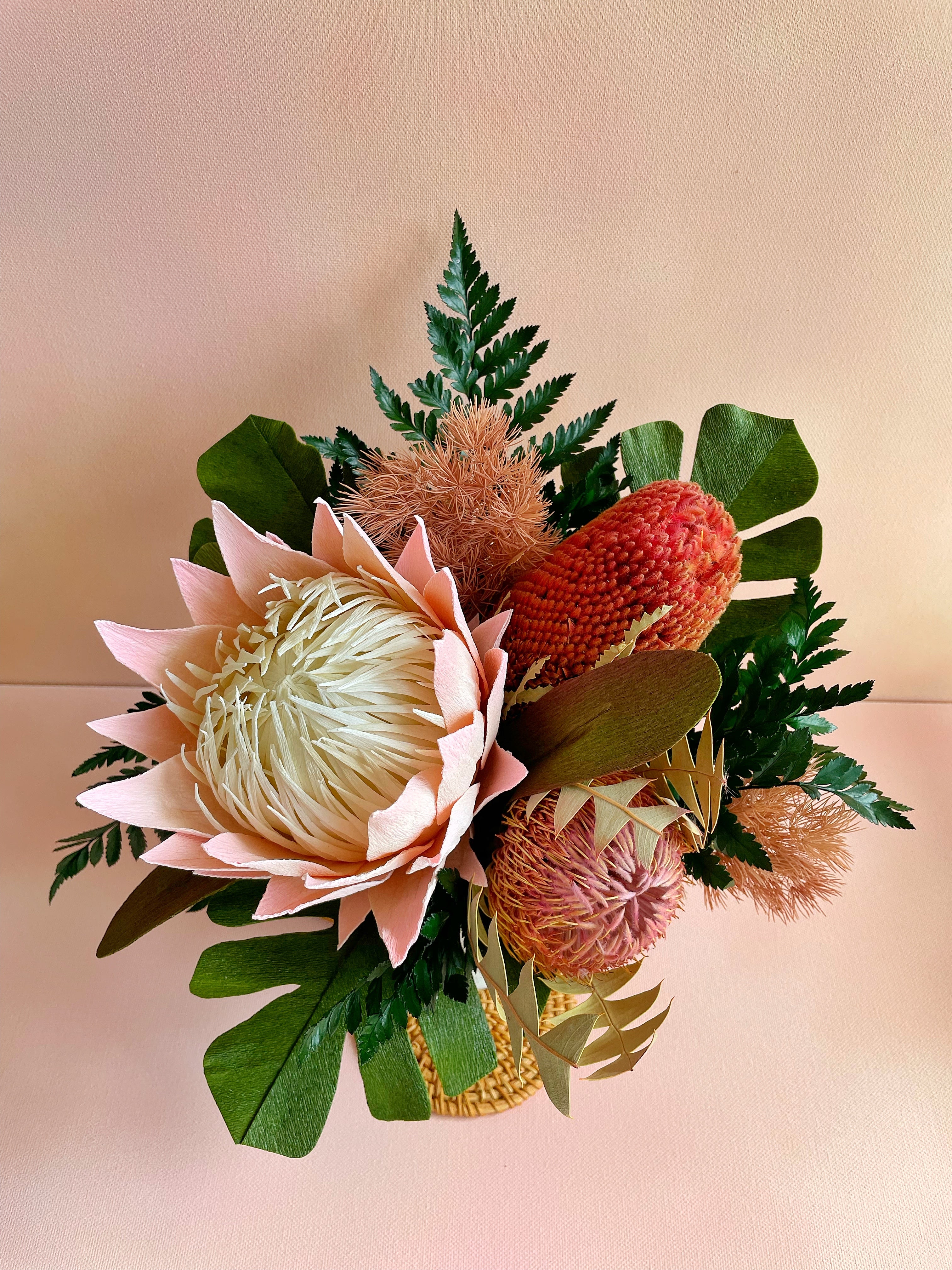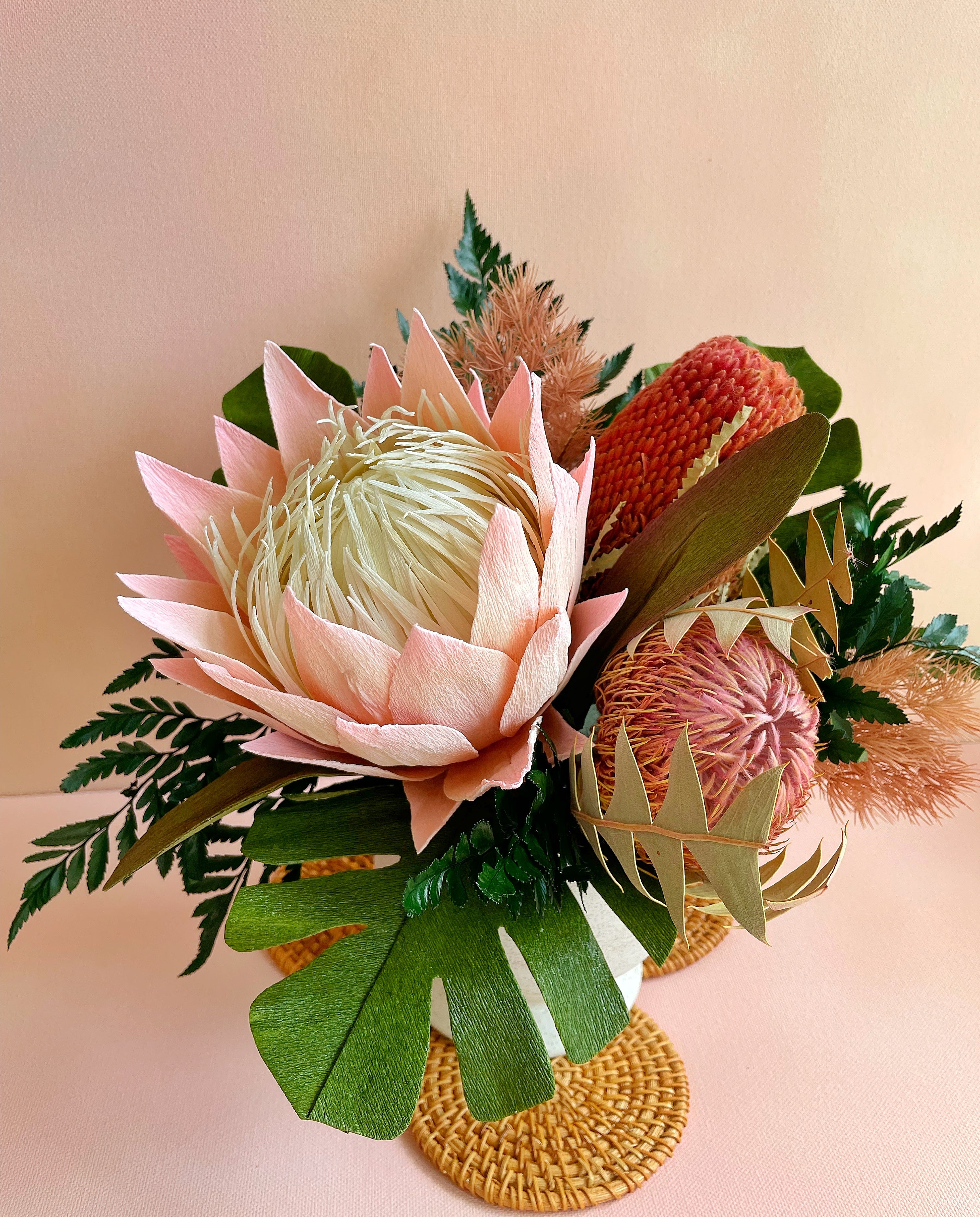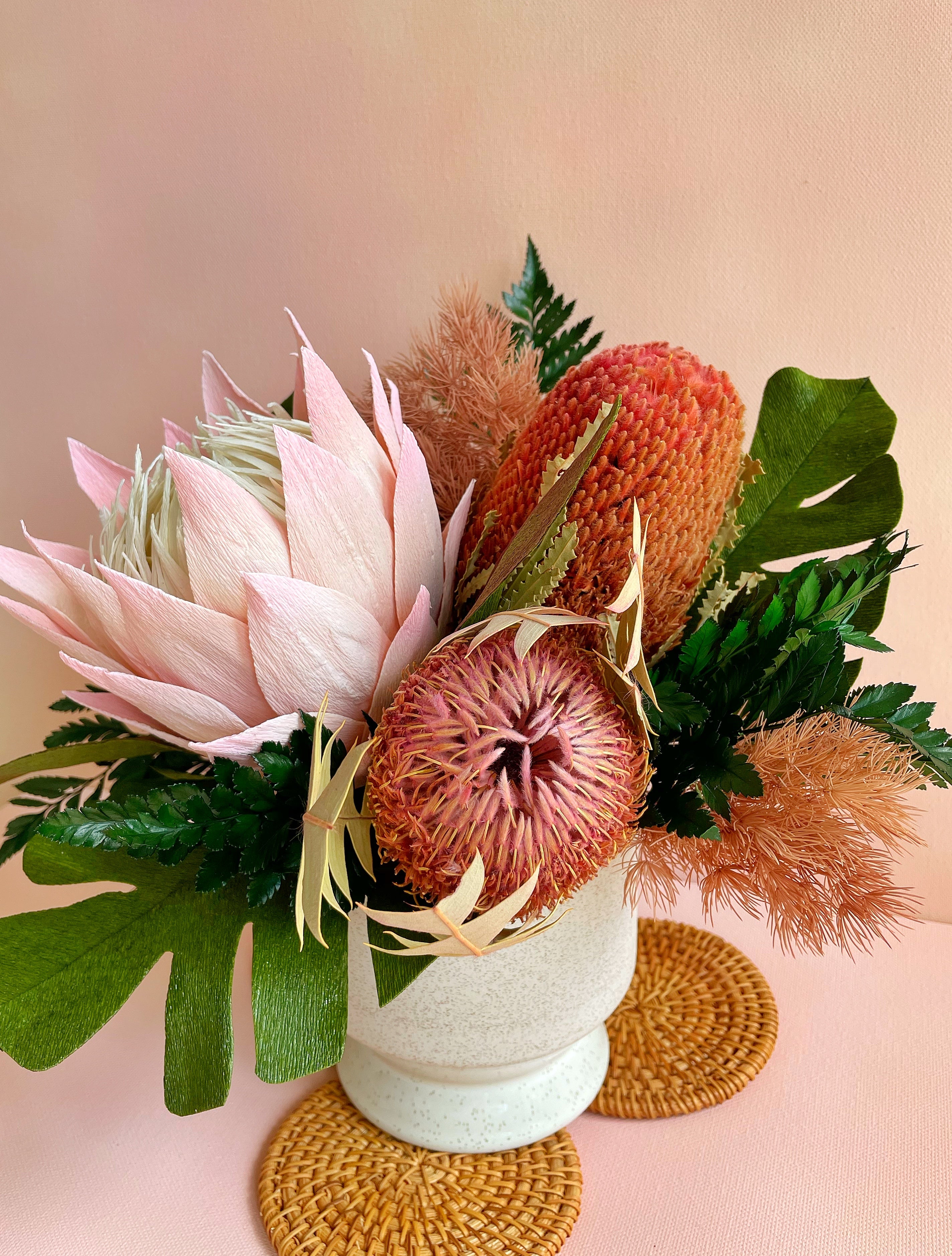 This one of a kind vase arrangement features a stunning pink king protea with paper monstera leaves and a preserved baskia protea in a modern white vase. It’s accompanied by preserved greenery to add texture and depth. This piece is a perfect addition to add some tropical vibes to any...