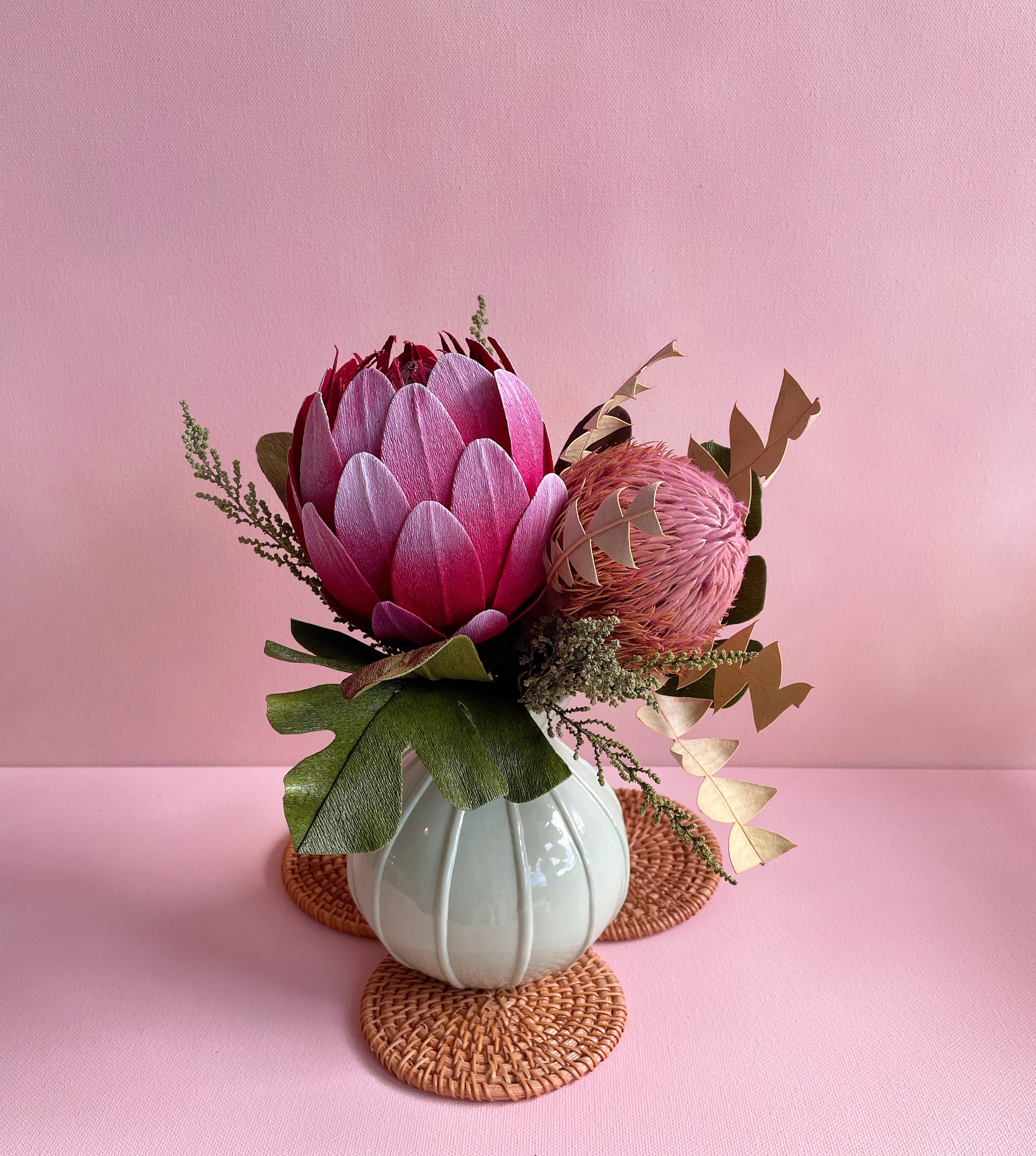 This one of a kind vase arrangement features a stunning dark red queen protea with paper monstera leaves and a preserved baskia protea in a vintage mint glass vase. It’s accompanied by preserved greenery to add texture and depth. This piece is a perfect addition to add some tropical vibes...